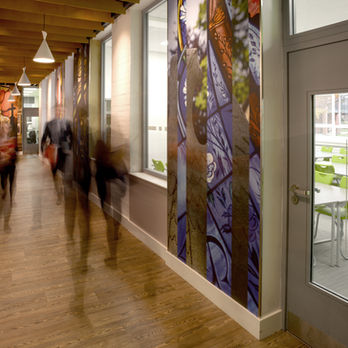 Our design created large window openings between the classrooms and corridors, forming a rhythm of original brickwork and canvases of colourful art, punctuated by large internal windows to add natural light. The increased transparency between teaching spaces and corridors, coupled with high-quality finishes transformed this building into a 21st century educational environment which was well received by students and staff alike. The spaces are durable and have thrived in rigorous day-to-day use.